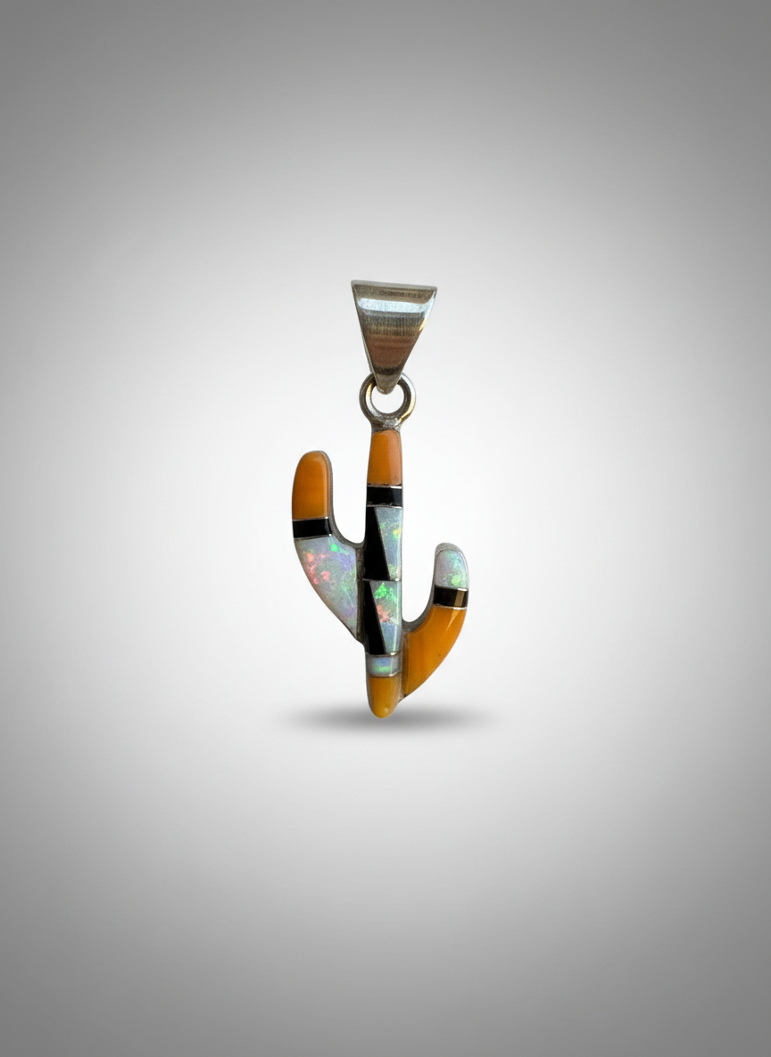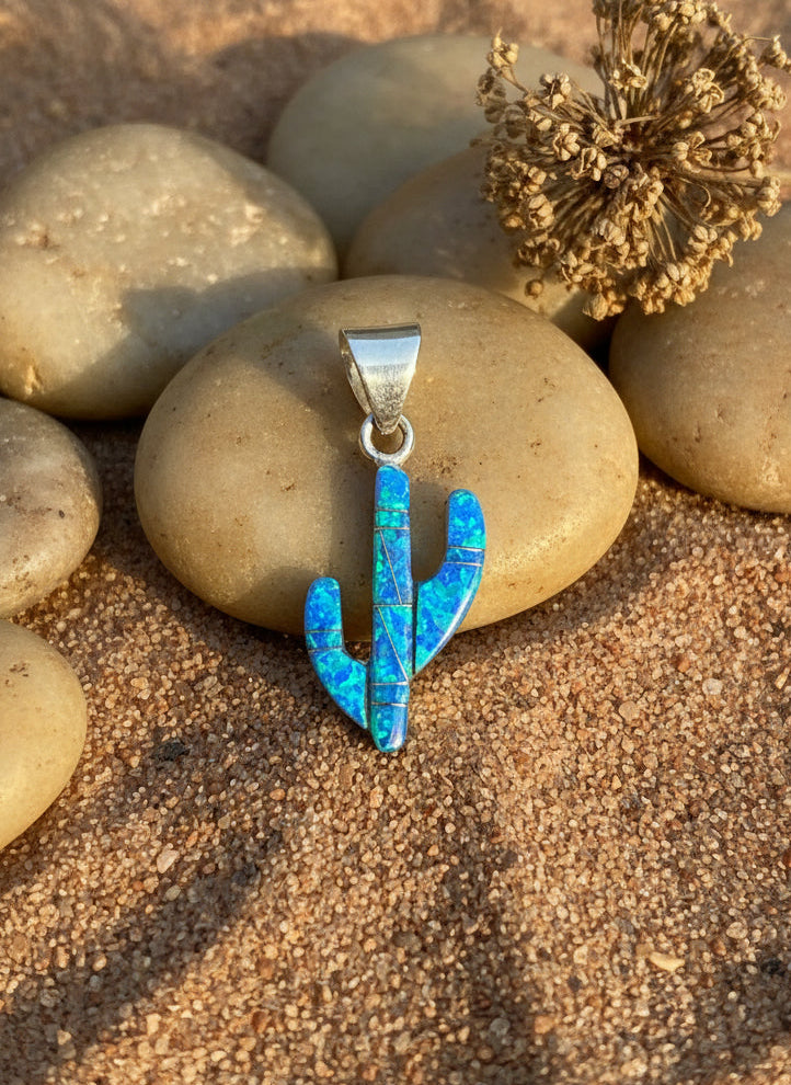 This is a double-sided cactus pendent, one side is Jasper, Black Jade & White Cultured Opal and the other side is dark blue cultured opal