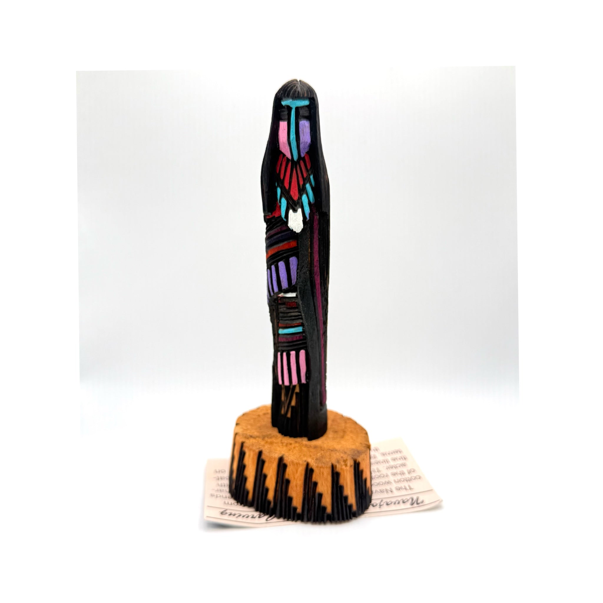 Each Kachina is hand-carved using traditional methods and aged cottonwood. The natural curves and bends in the wood inspire the form and character of each figure. Unique to Jerald’s work the intricate, fine lines are burned into the surface, creating detailed patterns across the body. Bright colors are then hand-painted, bringing each Kachina to life with personality and spirit.
