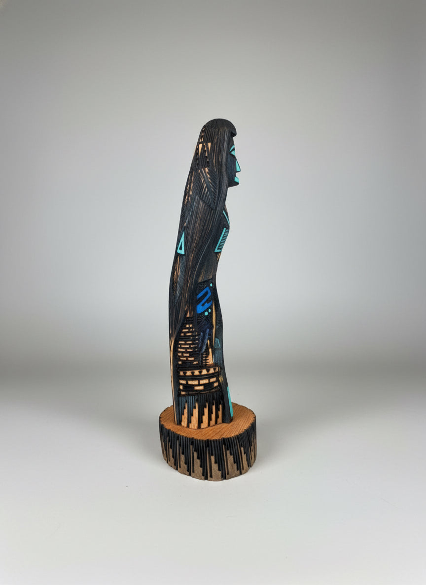 Each Kachina is hand-carved using traditional methods and aged cottonwood. The natural curves and bends in the wood inspire the form and character of each figure. Unique to Jerald’s work the intricate, fine lines are burned into the surface, creating detailed patterns across the body. Bright colors are then hand-painted, bringing each Kachina to life with personality and spirit.