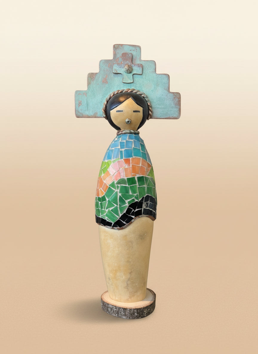 These handmade Kachinas are crafted from natural gourds of various sizes. Each design is hand-painted and accented with clay, copper patina, and copper leaf, making every piece truly unique and one of a kind