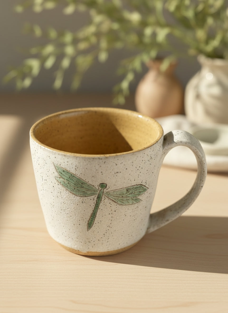Handmade Ceramic Mug with two-sided Dragonfly Design by Jammie Parish (Arizona Artist)