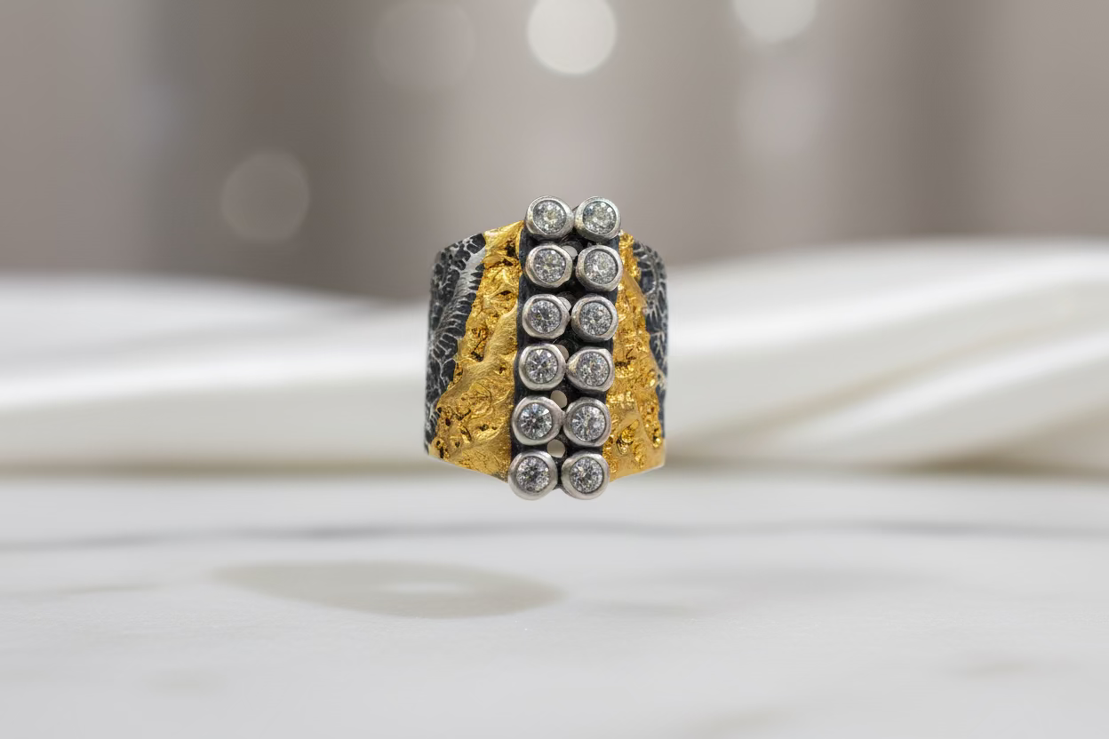 Handmade Ring in Textured Sterling Silver with 24-Carat Gold