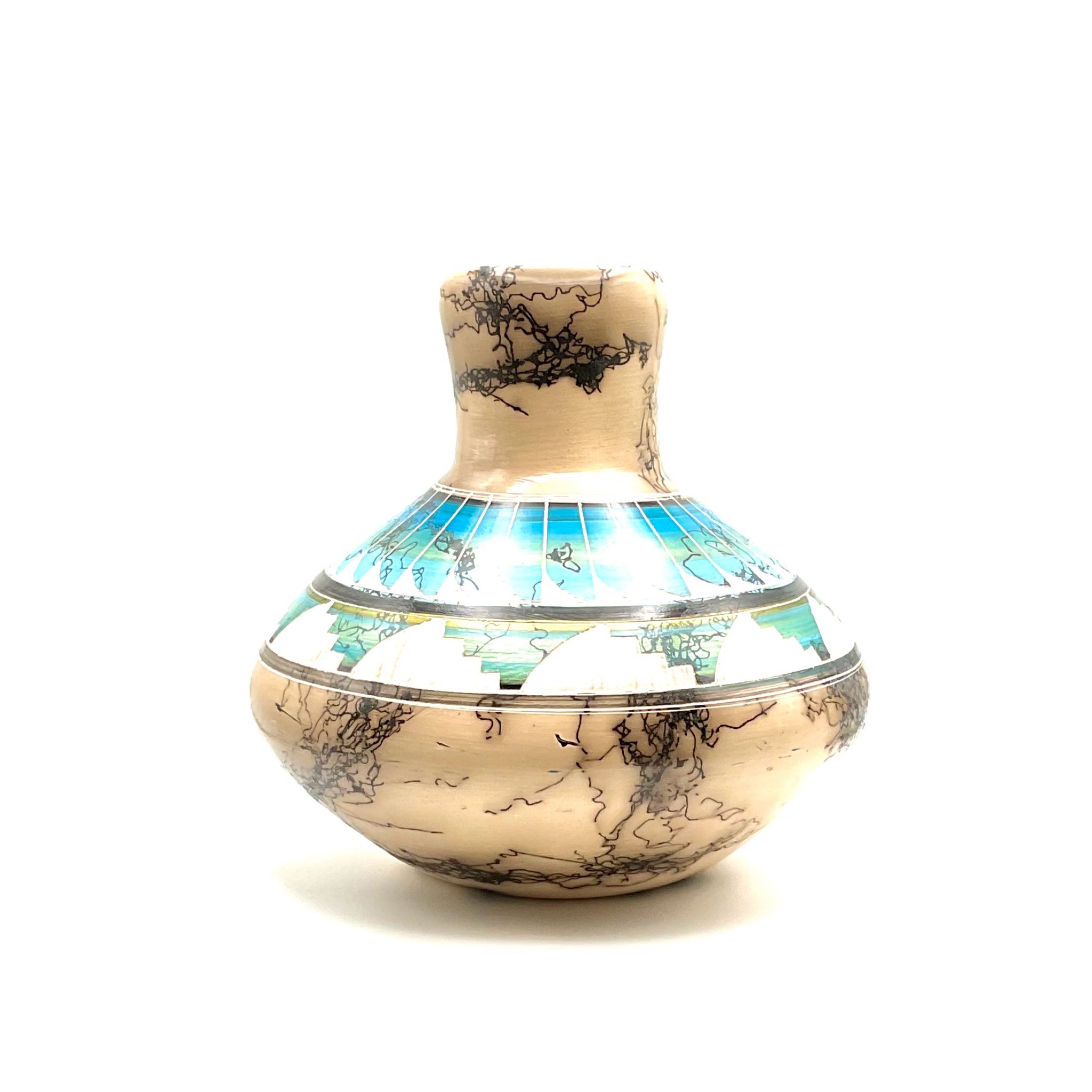 Horsehair Pottery: Navajo horsehair pottery has been an essential part of Navajo culture for centuries. Originally created for practical uses like carrying water and storing food, it has evolved into a unique art form. In Navajo horsehair pottery, artists place horse mane and tail hair onto the clay, then fire it in a kiln. The fine lines come from the mane, while the thicker lines are made from the tail. Once fired, the pottery becomes smooth and shiny, making each piece one-of-a-kind. While these pieces were once functional, they are now cherished as decorative art. Please note that each pottery piece is handmade, so it may vary slightly from the image shown.