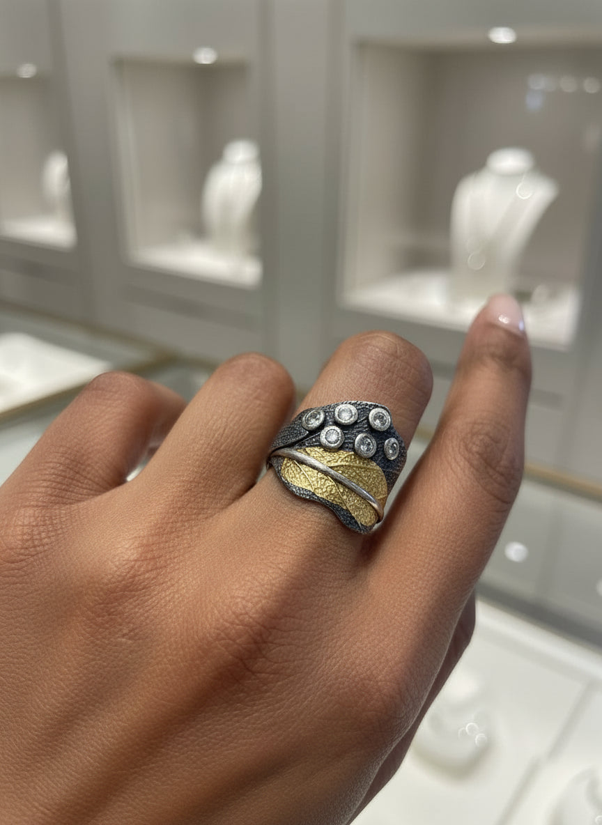 Oxidized Sterling Silver & 24k Gold Ring — Custom Stones & Metals, Handmade Luxury