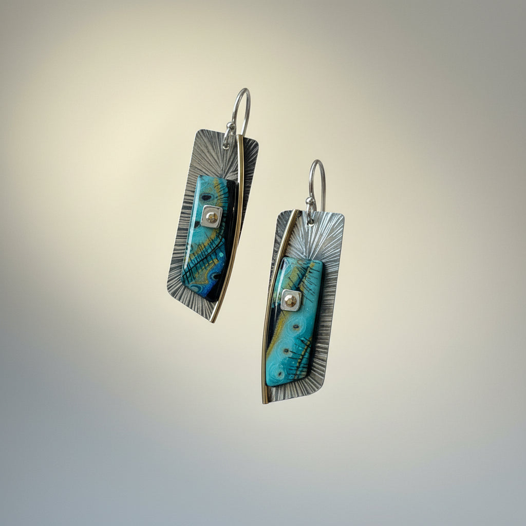 Each unique polymer art piece is mounted to rustic pewter with a brass and sterling silver rivet then laced with 14k gold-filled wire.  The top detail is brass and the side wave is sterling silver.