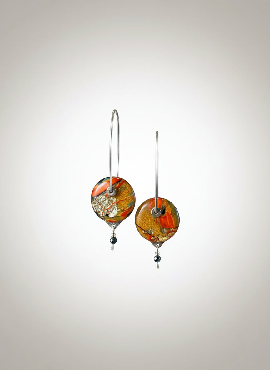 Each unique polymer art piece is mounted to rustic pewter with a brass and sterling silver rivet then laced with 14k gold-filled wire. The top detail is brass and the side wave is sterling silver.