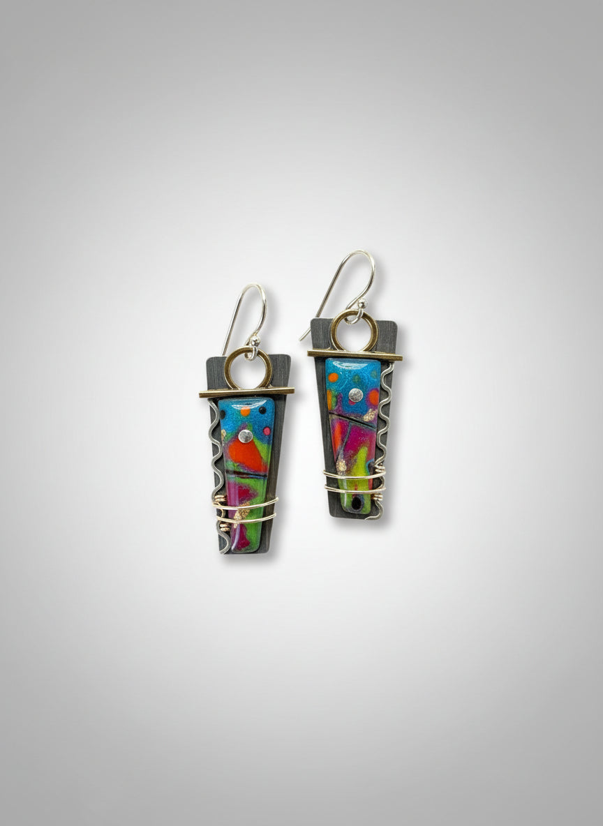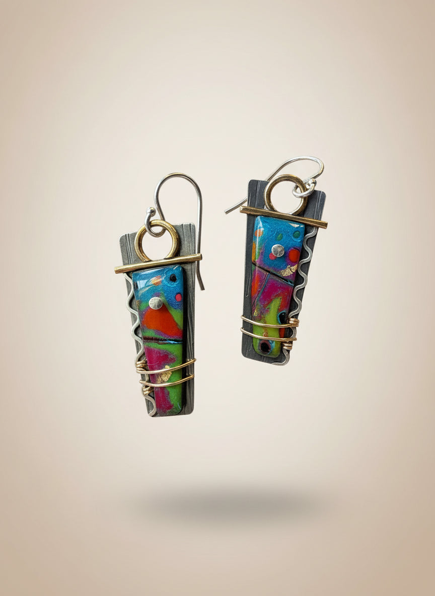 Each unique polymer art piece is mounted to rustic pewter with a brass and sterling silver rivet then laced with 14k gold-filled wire. The top detail is brass and the side wave is sterling silver.
