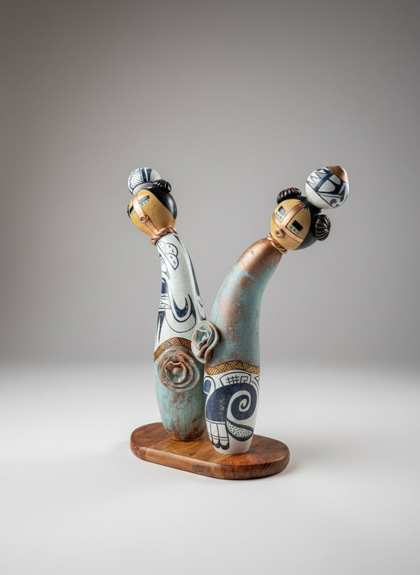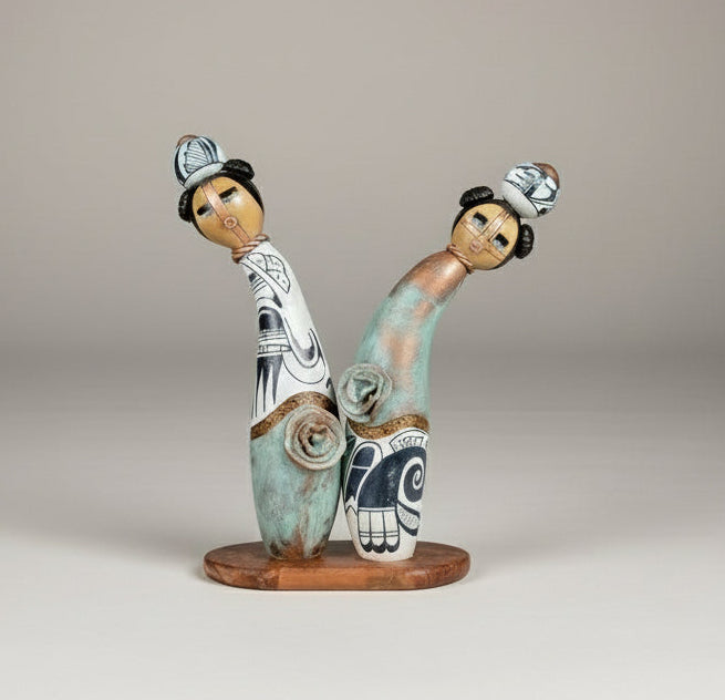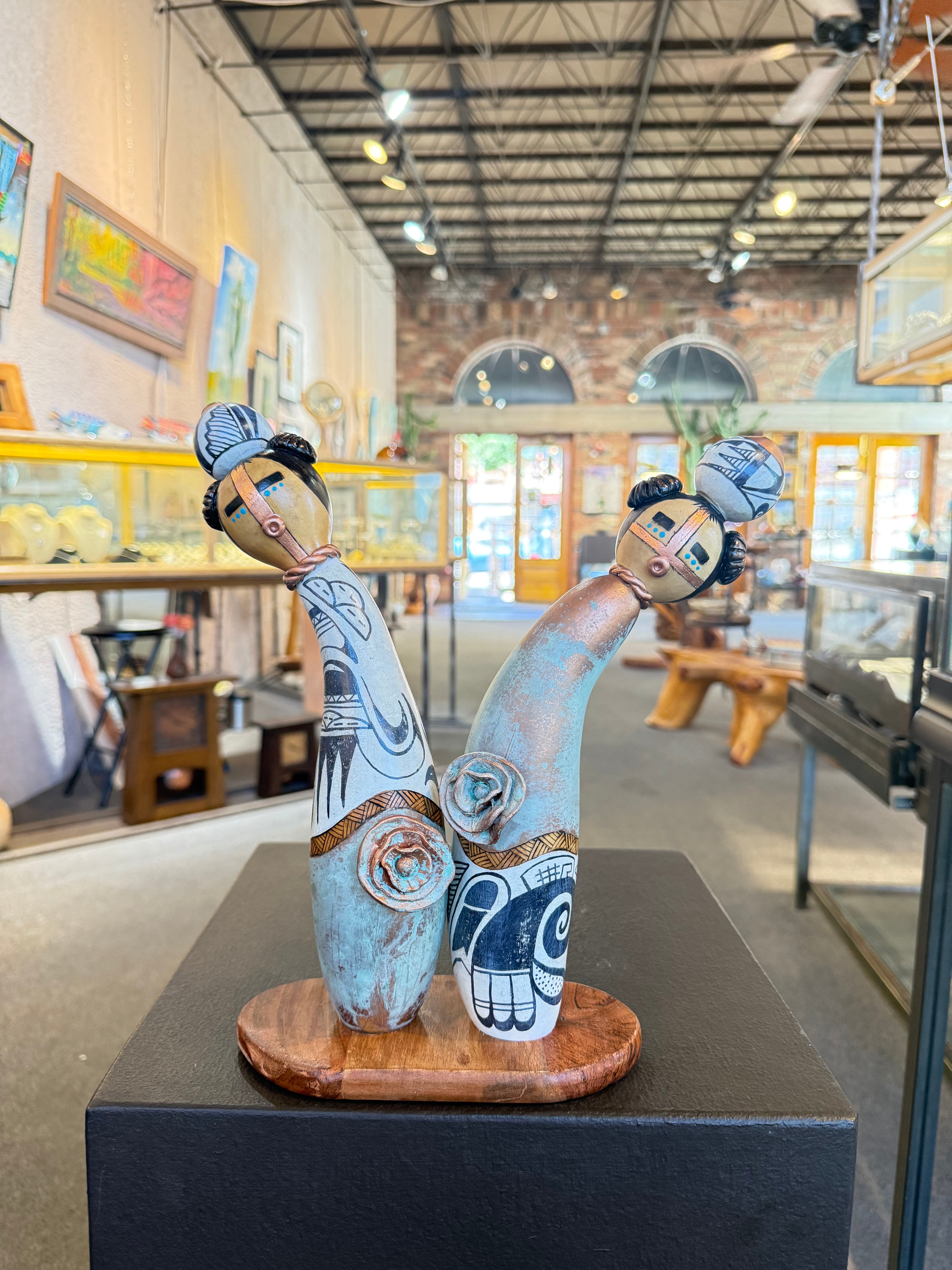 These handmade Kachinas are crafted from natural gourds of various sizes. Each design is hand-painted and accented with clay, copper patina, and copper leaf, making every piece truly unique and one of a kind